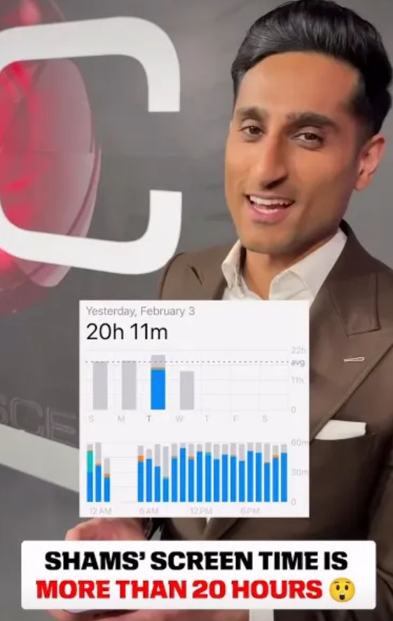 Shams之前曾经晒出过自己的手机亮屏时间,为了能够精准第一时间报道新闻,他的手机亮屏时间超过20小时,他还调侃说“除非你不睡觉,要不你爆料不会比我快。”