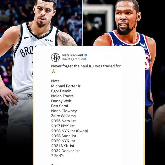 也就是说,如果小波特再被换出1个首轮签,那么相当于篮网从杜兰特的交易里得到了11个首轮签、3个首轮互换、多个次轮签,简直炸裂。