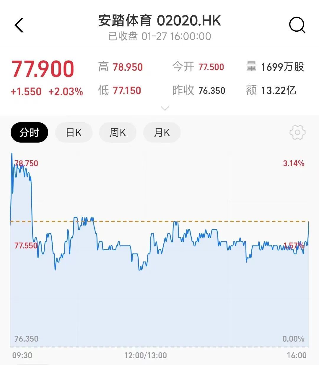 受消息刺激,安踏体育(02020.HK)当日股价开盘一度飙升3.4%至最高位78.95港元,随后虽经历波动,依然以77.9港元收盘,止住此前连续4个交易日的跌势。