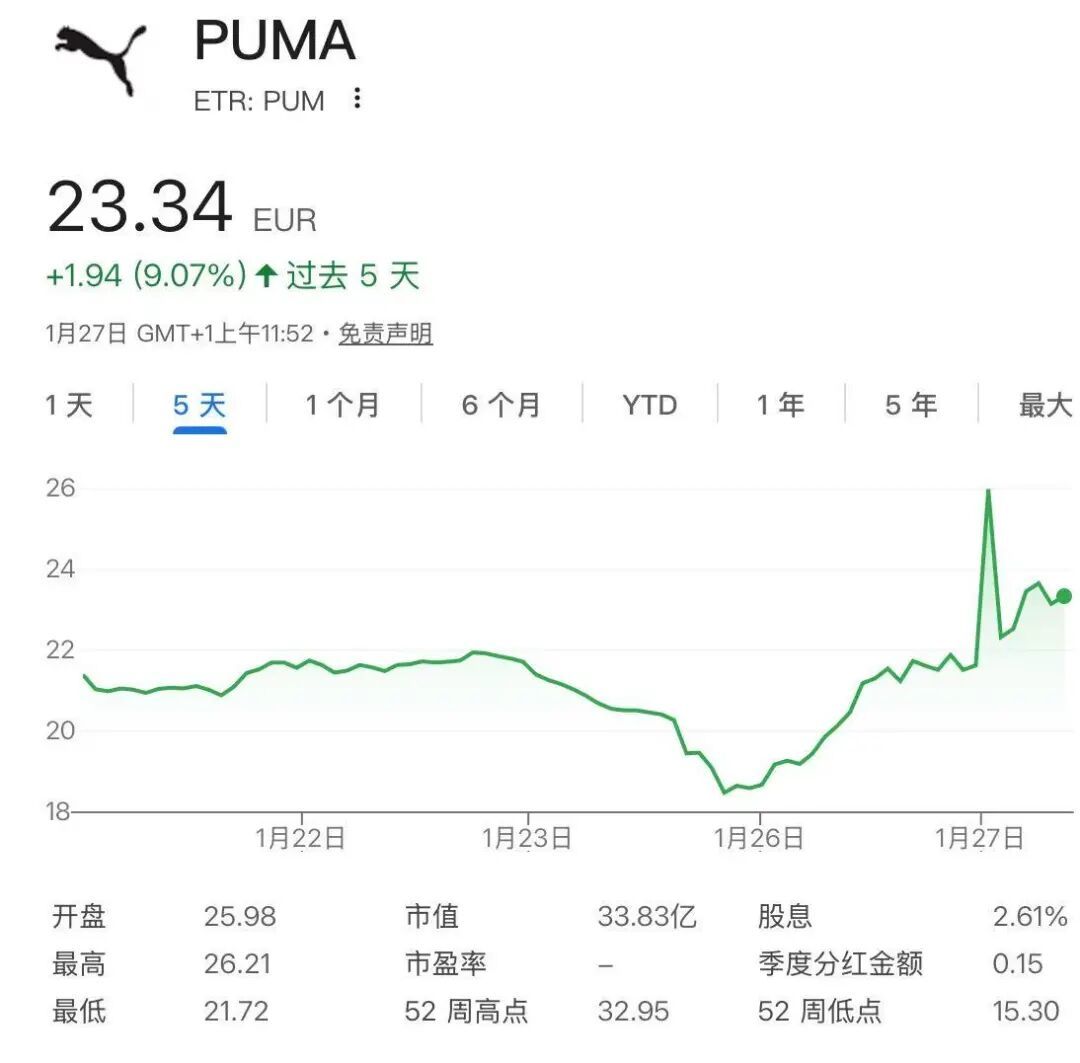 而彪马(PUM.DE)股价在收购公布当日(1月26日)收盘价为21.63欧元,安踏收购价(每股35欧元)对比溢价61.81%,1月27日开盘高开至25.98欧元,一度飙升到最高26.21欧元,随后回落,截至发稿时为23.34欧元。