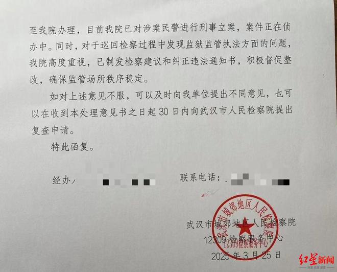 武汉城郊检察院今年3月向张涛开具的一份《信访事项处理意见书》显示,该院巡回检察组将查明的湖北省未管所相关民警涉嫌渎职犯罪的线索于2024年12月9日上报至省市院,省市院经综合研判,认定相关民警已涉嫌滥用职权犯罪,将该线索交办至该院办理,目前该院已对涉案民警进行刑事立案,案件正在侦办中。