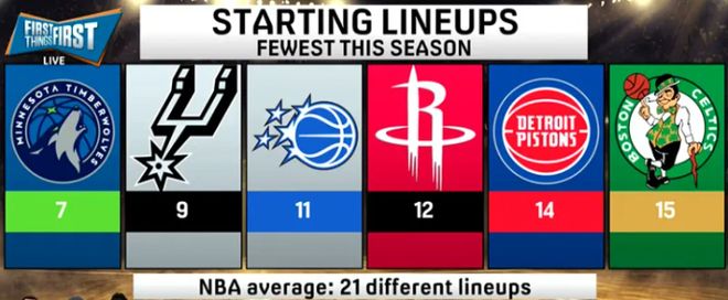 有意思的是,根据美媒B/R列出的数据显示,本赛季更换首发最少的球队,魔术(11套)和火箭(12套)分列三、四位,仅次于森林狼(7套)和马刺(9套),而联盟球队平均更换首发频率为21套。