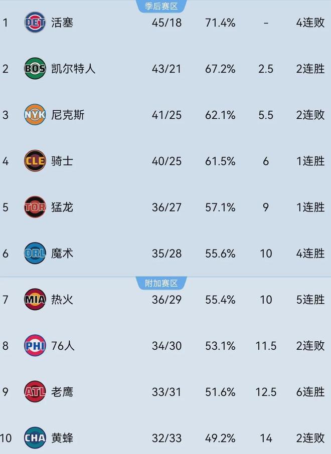 本赛季至今,热火取得36胜29负战绩排名东部第七,已抹平与第六的魔术(35-28)胜场数,且仅落后第五的猛龙(36-27)1个胜场,大有希望锁定一个直通季后赛名额。