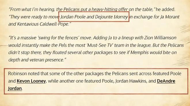 据悉,在过去一段时间里,鹈鹕管理层在追求莫兰特一事上态度非常积极,先后向灰熊提出了两套交易方案:
