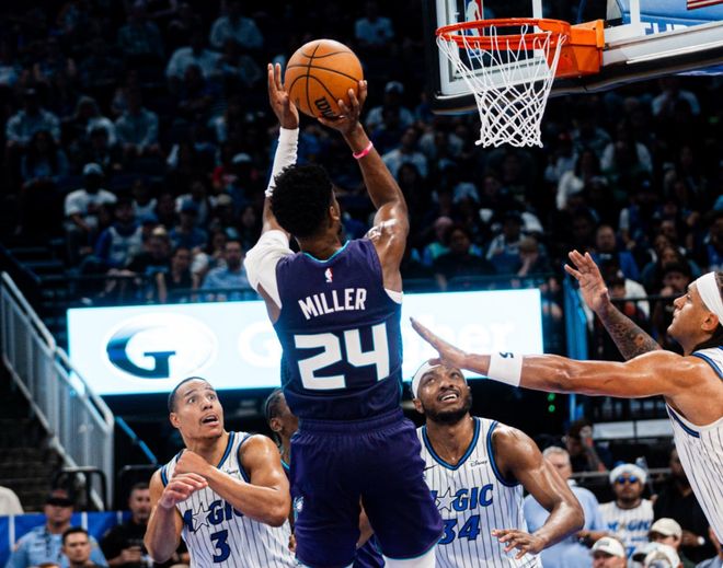 克尼佩尔提供最稳定的火力支援,未来绝对有机会冲击单赛季402记三分球历史纪录。布兰登米勒攻防一体,越来越像他偶像年轻版的保罗乔治,稳定提供产量保证,而且防守压迫性十足。迪亚巴特在马威离开后成功上位,场均8.4分8.7篮板的数据看起来一般,但他在场时,黄蜂篮板率高于联盟平均水准10.2%!举个例子就明白了,他更像是年轻几岁的亚当斯!布里奇斯不用多说,过去三个赛季场均20分的稳定输出,当初差点就拿到顶薪合同!此外,球队替补席还有第六人级别的科比怀特,来到黄蜂后场均13.5分4助攻。