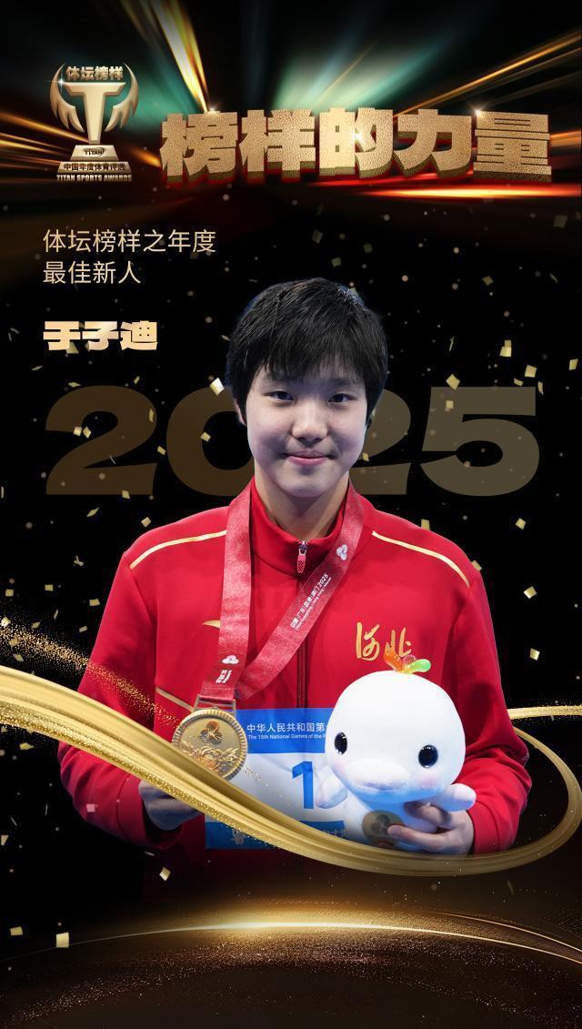 年度最佳新人奖归属13岁的泳坛小将于子迪。她在全运会上打破女子200米个人混合泳亚洲纪录,并以3金1银1铜的亮眼成绩横空出世,被视为中国游泳未来的重要力量。