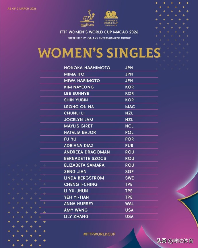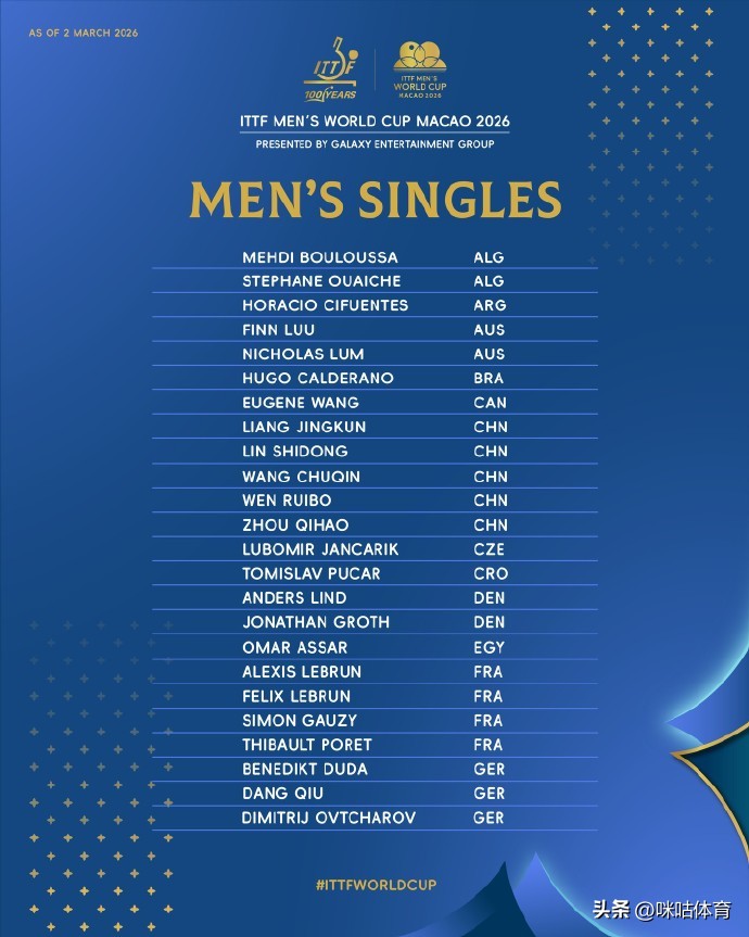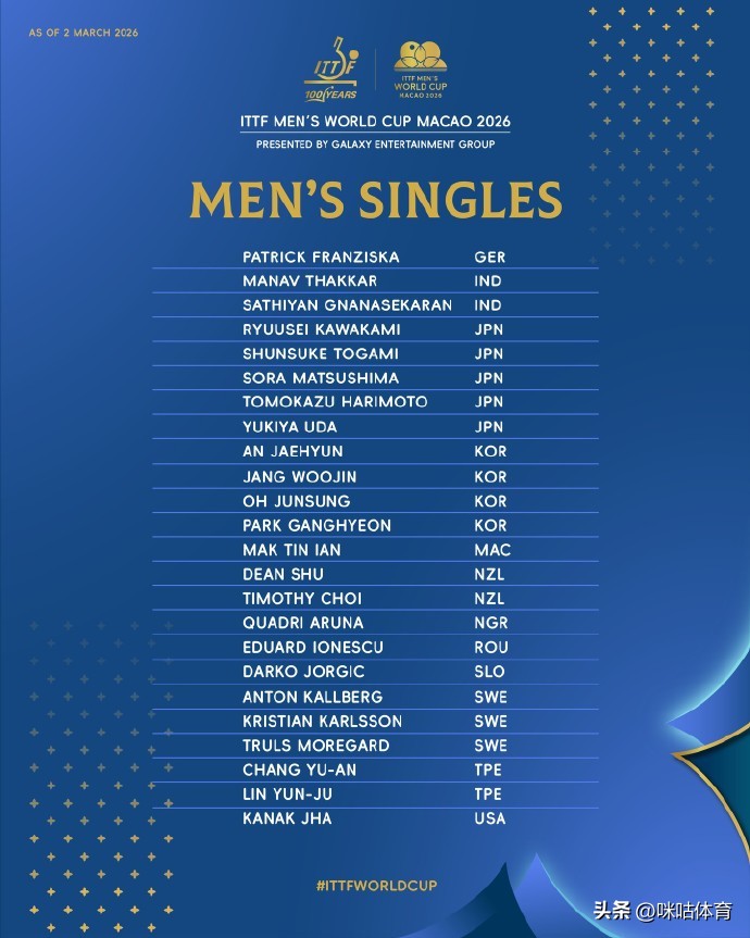 中国国家队也派出强大阵容参赛,王楚钦、林诗栋、梁靖昆、周启豪、温瑞博五位男队选手,以及王曼昱、陈幸同、蒯曼、王艺迪四位女队选手悉数入围,全力冲击好成绩。此外,2025年世青赛U19组别男女冠军也顺利参赛,分别是日本选手川上流星与中国选手覃予萱,两人凭借世青赛冠军的身份直接获得本次赛事资格,成为赛场上的青春力量代表。其余参赛选手则通过洲际杯赛事成绩及世界排名,成功锁定参赛席位,确保了赛事的全球代表性与竞技水准。