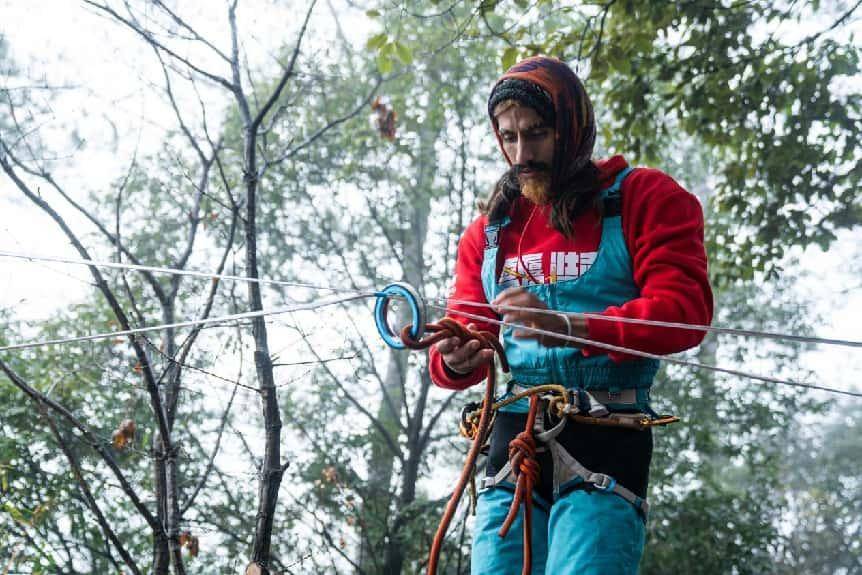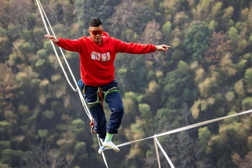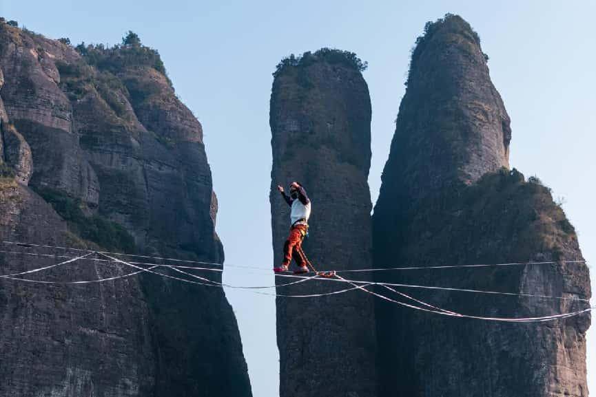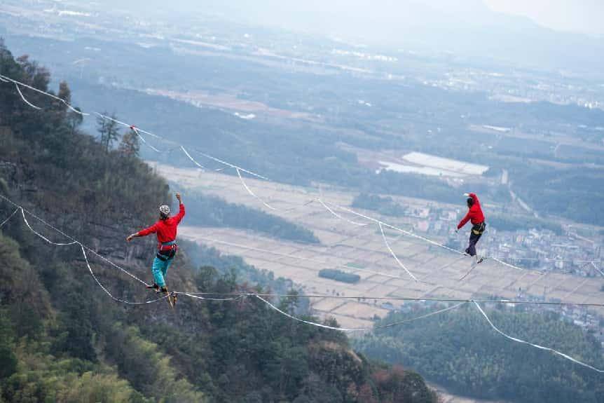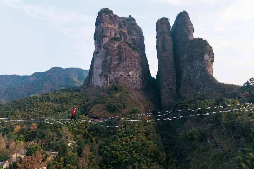 本次表演赛的核心赛场,架设于江郎山标志性地质奇观“三爿石”之间,两条长达430米的专业高空扁带,连接塔山观景台与霞客亭。参赛阵容星光熠熠,包括2024年瑞士世锦赛冠军、60米及100米高空扁带竞速世界纪录保持者萨沙·格里尔( GRILL SASCHA),2025年法国世界杯及爱沙尼亚红牛大师赛的双料冠军马特乌斯·斯托科·维达尔(STOCO VIDAL MATHEUS),被誉为“亚洲高空花式扁带第一人”的国内扁带高手施海林等十名世界顶尖扁带运动员。