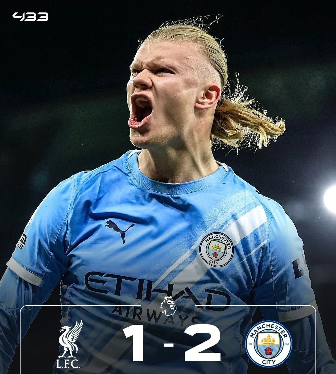 下半场补时第3分钟,努内斯在禁区内阿利松出击放倒,主裁判果断判罚点球并出示黄牌,哈兰德主罚点球命中逆转绝杀,脱衣庆祝领到黄牌,比分1-2!