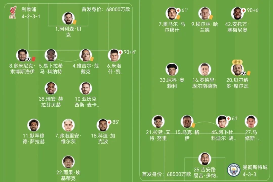 相比之下,瓜迪奥率领的曼城依旧处于争冠行列,总进球数高居联赛第一。双方此战尽遣主力,埃基蒂克、萨拉赫、维尔茨、加克波,马尔穆什、哈兰德、塞梅尼奥各自领衔两队进攻群。
