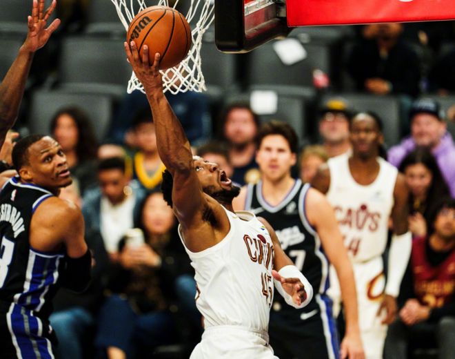 后半段米切尔带着替补逐渐缩小分差,托布手感火热,第一节骑士25-31落后,哈登只有助攻。进入第二节,汤姆林暴扣+埃利斯三分,米切尔和施罗德也轮流单打,国王进攻全面哑火,埃利斯手感火热,骑士打出15-2拉开分差。中段哈登回来,德罗赞和威少继续上分,阿伦和泰森回应。威少命中三分后,哈登标志性的撤步三分终于来了,此后阿伦暴扣+造犯规,但节末国王角色球员多点开花,半场骑士57-55领先。哈登半场3分4助,正负值-14;威少13分4助。进入下半场,哈登和米切尔轮流带动阿伦吃饼暴扣,但国王手感也很好。