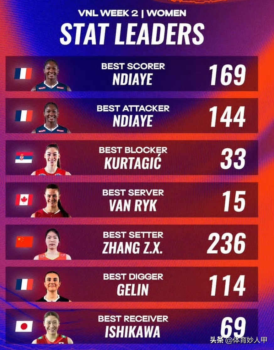1、最佳进攻球员:法国女排的接应恩迪亚耶,进攻得169分;