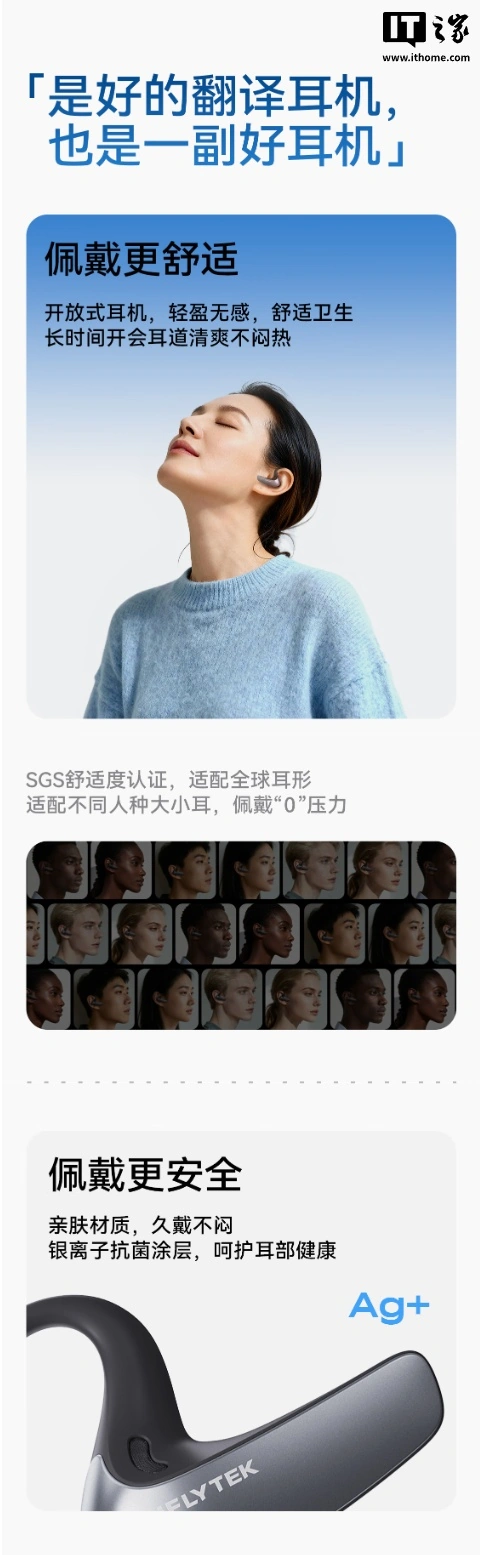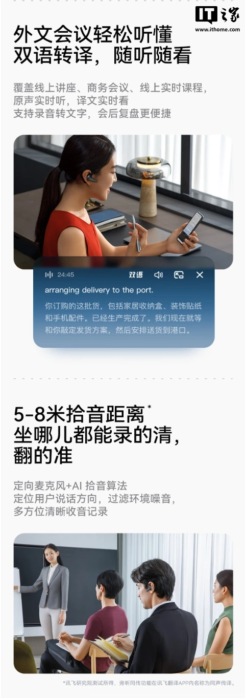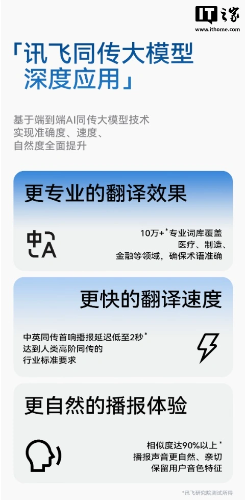 据介绍,这款耳机搭载讯飞端到端 AI 同传大模型技术,覆盖医疗、制造、金融等领域 10 万 + 专业词库,可确保术语准确,中英语同传首响播报延迟低至 2 秒,号称达到“人类高阶同传的行业标准要求”,播报声音相似度可达 90% 以上,实现更自然的翻译体验。