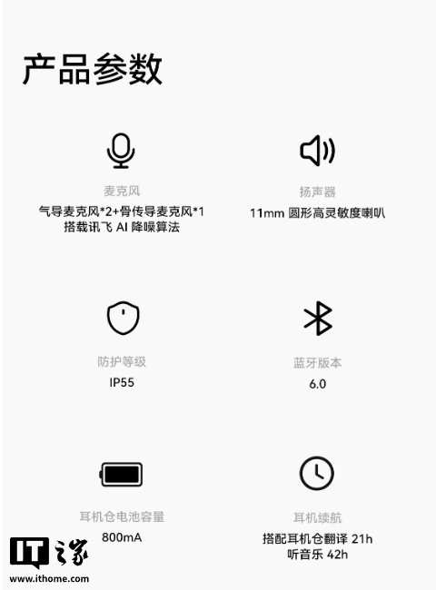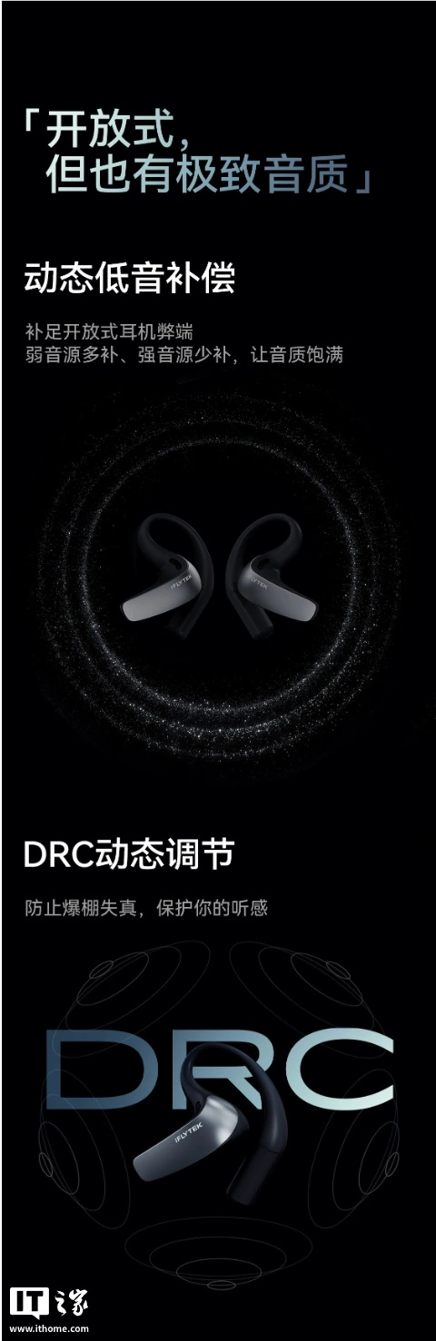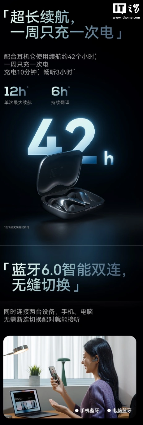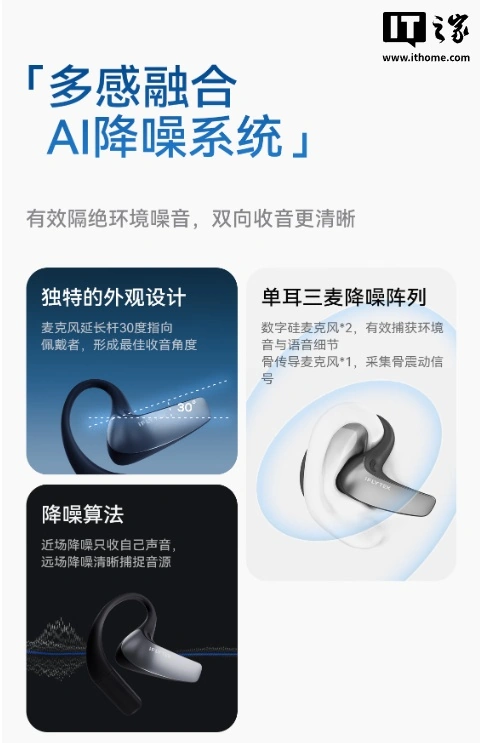 硬件方面,这款耳机采用挂耳式开放设计,单耳机内置三麦降噪阵列,可有效捕捉环境声和语音细节,配备降噪算法,可在近场、远场场合下捕捉清晰声音,拾音距离可达 5-8 米,单次最大续航 12 小时,配合充电盒使用续航约 42 小时。