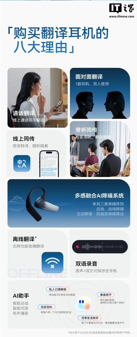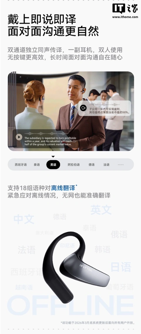 IT之家 11 月 19 日消息,科大讯飞 AI 翻译耳机现已开启预售,采用耳挂式开放设计,支持通话翻译、面对面翻译、旁听同传等特性,还拥有 AI 助手,可实现智能总结、问答等,现已开启预售,价格 2499 元。