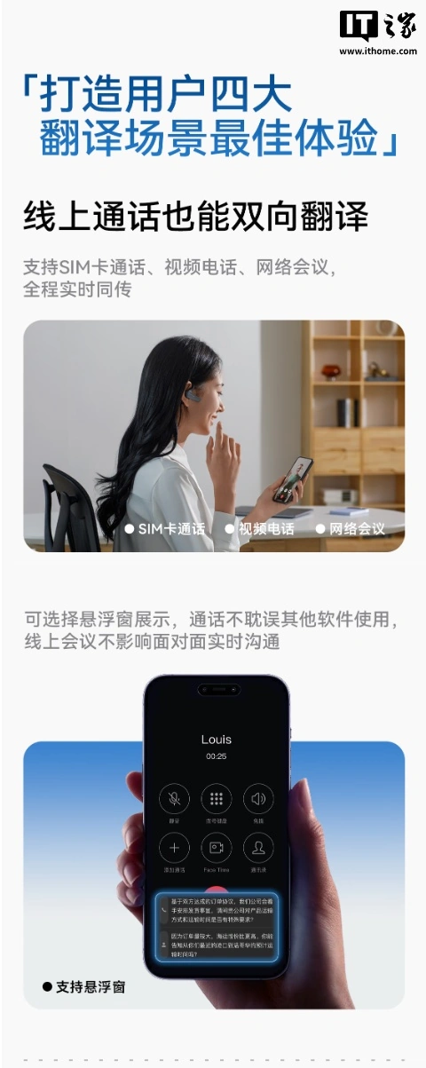 软件方面,这款耳机支持线上通话双向翻译,可选择悬浮窗显示翻译内容,不影响其他软件使用,支持双通道独立同声传译功能,可让对话双方各戴一副耳机,实现无按键同传,支持 18 组语种离线翻译,还可保存原生 + 译文音频和转写文字,随时对照翻译文字记录。
