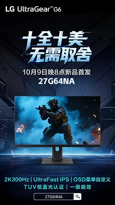 LGUltraGear 系列显示器深耕电竞领域再出重拳,双模全家桶产品矩阵焕新、LG 27G64NA 超级新品 10 月 9 日首发、‘十全十美超级玩家’活动同步开启,以多元布局与实用创新,为玩家打造全场景电竞解决方案