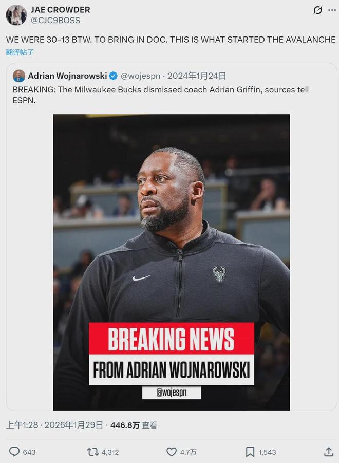 克劳德旧事重提,让里弗斯非常尴尬,老里回应:“克劳德对自己在雄鹿的上场时间不满。”教主帮大家捋一捋,2023年夏天,字母哥指定阿德里安-格里芬担任雄鹿主帅。2024年1月格里芬被解雇,当时雄鹿30胜13负高居东部第二。