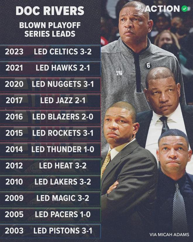 很多人嘲讽里弗斯是鸡汤大师,没什么真本事,尤其是季后赛频频被翻盘:1、当球队3-2领先时7次被翻盘;2、10次输掉抢七大战;3、32次输掉终结系列赛的比赛。这三项都是NBA历史纪录!NBA被逆转之王,绝对不是说说而已。