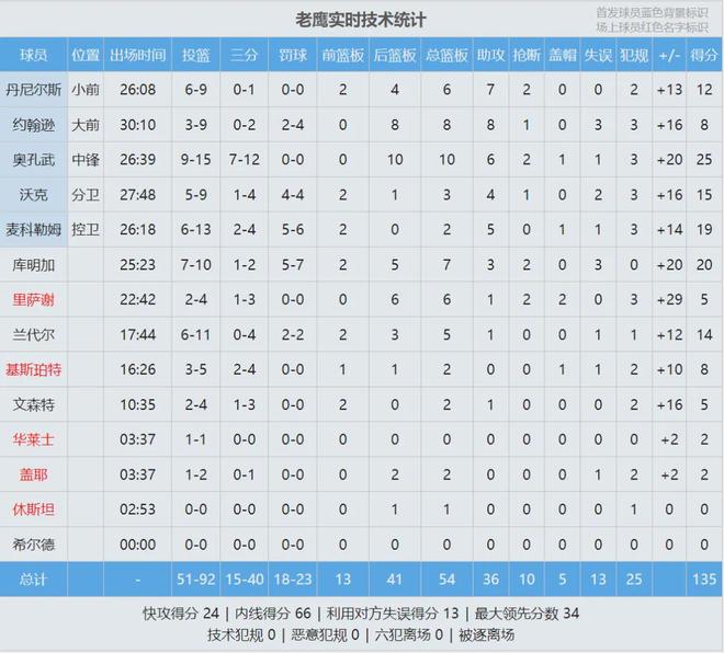 老鹰31胜31负东部第9,领先第10黄蜂0.5个胜场。老鹰新援库明加替补出战25分钟,投篮10中7,三分2中1,罚球7中5,砍下20分7篮板3助攻2抢断3失误0犯规,正负值+20并列全场第二!第四节还剩3分多钟,库明加隔扣杨瀚森。