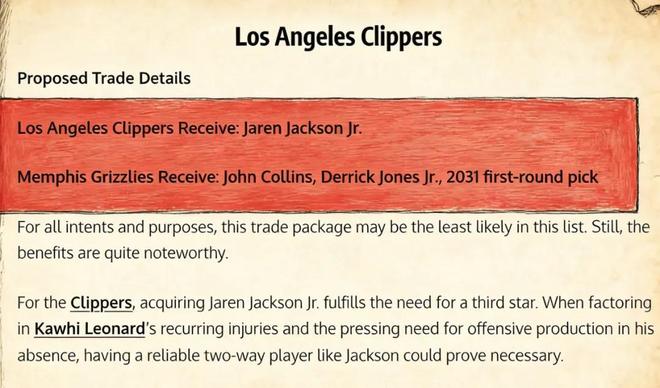 美媒《Fadeaway World》撰文建议,快船可以考虑将科林斯、小琼斯以及2031年的首轮签送到灰熊,引入小杰克逊。