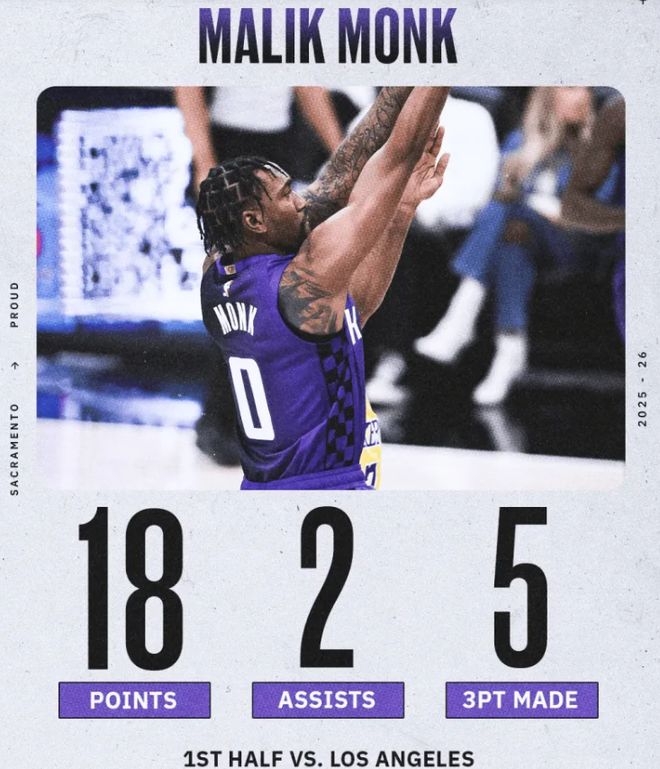值得一提的是,湖人上半场全队三分合计19投3中,命中率不足15.8%(两分27中18、命中率66.7%);国王全队三分12投8中,命中率高达66.7%。