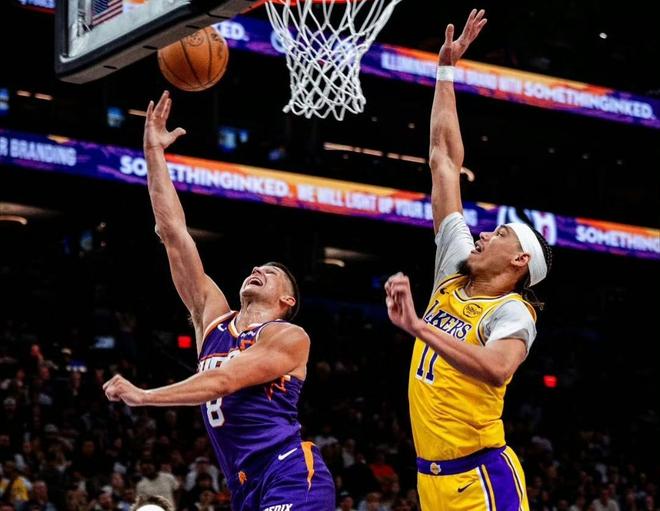 NBA常规赛,太阳坐镇主场迎击湖人队。本场比赛之前,湖人34胜23负排名西部第6,近段时间湖人状态不算稳定,遭遇2连败,对阵季后赛级别的对手,球风强硬的对手,确实要差点意思,虽然湖人全员健康,东契奇,詹姆斯,里夫斯三巨头联手,又在交易截止日前引进肯纳德,迎来了本赛季联盟第一准的三分射手,但湖人阵容还是存在短板,替补得分能力不足,再加上核心防守水平有限,可能会阻碍他们在季后赛进一步突破上限。另一边的太阳队,本场比赛之前,33胜26负排名西部第7,尽管去年失去了杜兰特和比尔,但太阳今年仍然有冲击季后赛的机会。
