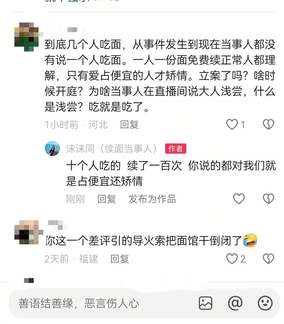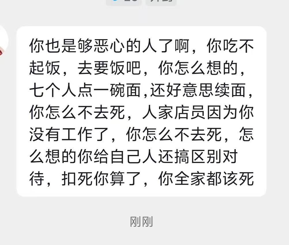 今年8月份,郑州一面馆老板因续面问题将马女士及其孩子的视频发布至网络。视频中,该老板发布的“只点了一碗面”“顾客消费70余元”等言论,引起轩然大波,导致顾客马女士及家人被网暴。之后,马女士晒出140余元的账单还击,舆论纷纷倒戈,面馆被迫关停。