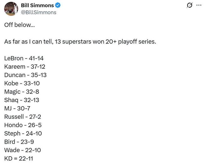 根据名嘴比尔-西蒙斯统计,NBA历史上只有13人在季后赛至少赢得20次系列赛胜利,杜兰特是其中之一。
