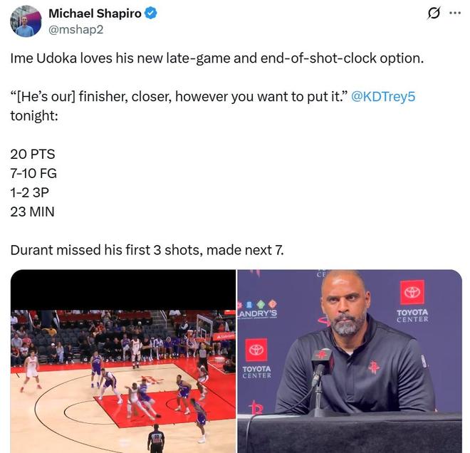 加上原本的内线终结点申京全面蜕变,新赛季火箭队有希望一改往日便秘的进攻表现,成长为一支多点开花的进攻大队。