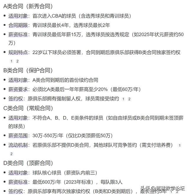 NBA的合同比较透明,合同年限和金额大家都能知道。CBA把合同设置为A类、B类、C类、D类和E类,每一类合同的年薪都有一个范围区间,顶薪上限为600万。E类是“老将合同”,这里不用过多解释,大家可以看看ABCD四种: