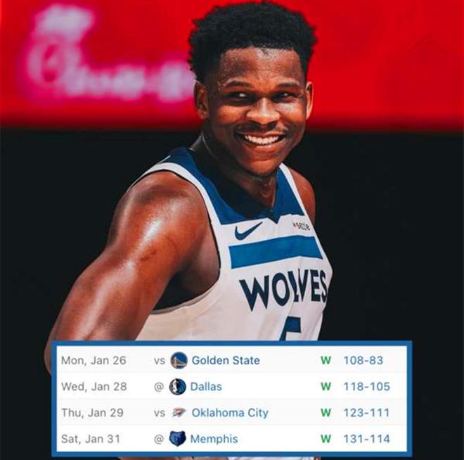 赛后森林狼官方发文到:“我们拿到了西部目前现存最长的连胜—4连胜。”