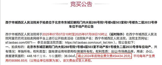 竞买公告显示物业费欠费45万余元 来源:阿里资产·司法平台