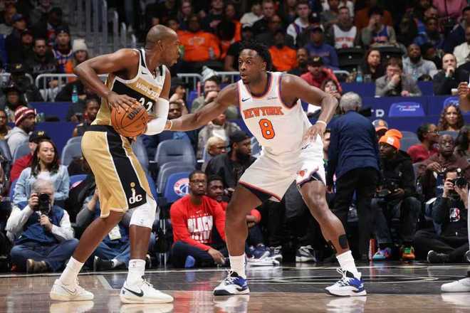次节比赛,尼克斯连续两节单节得分30+,且限制奇才连续两节单节不足25分,尼克斯继续攻防压制奇才,唐斯、阿奴诺比与布里奇斯联手得分,尼克斯单节34-23净胜11分。前两节比赛,尼克斯三分24中12,唐斯16+7、阿奴诺比15分与布里奇斯4中4得到12分,且限制奇才三分15中5,全队没有球员得分上双,上半场比赛结束尼克斯已经扩大72-45领先奇才27分巨大优势。