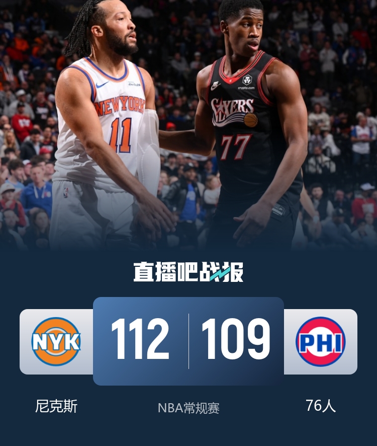 比赛开始,两队开场大打对攻,尼克斯全队高效输出,恩比德连投带罚给出回应,布伦森内外开花,次节恩比德内外开花弹无虚发,率队占据场上主动,尼克斯多点开花还以颜色,半场战罢76人64-60领先尼克斯。易边再战,76人突然哑火,尼克斯轰出19-3的进攻高潮获得两位数优势,末节分差一度来到17分,末节76人奋力反击打出12-0的攻击波迅速迫近比分,关键时刻沙梅特和马克西对飙三分,布伦森被吹进攻犯规,但尼克斯挑战成功改判埃奇库姆提前犯规,尼克斯3罚2中稳住局势,76人关键时刻挑战也成功,但马克西三分不中,布伦森两罚全丢后阿努诺比抢断恩比德杀死比赛。最终,76人109-112不敌尼克斯,主场落败。