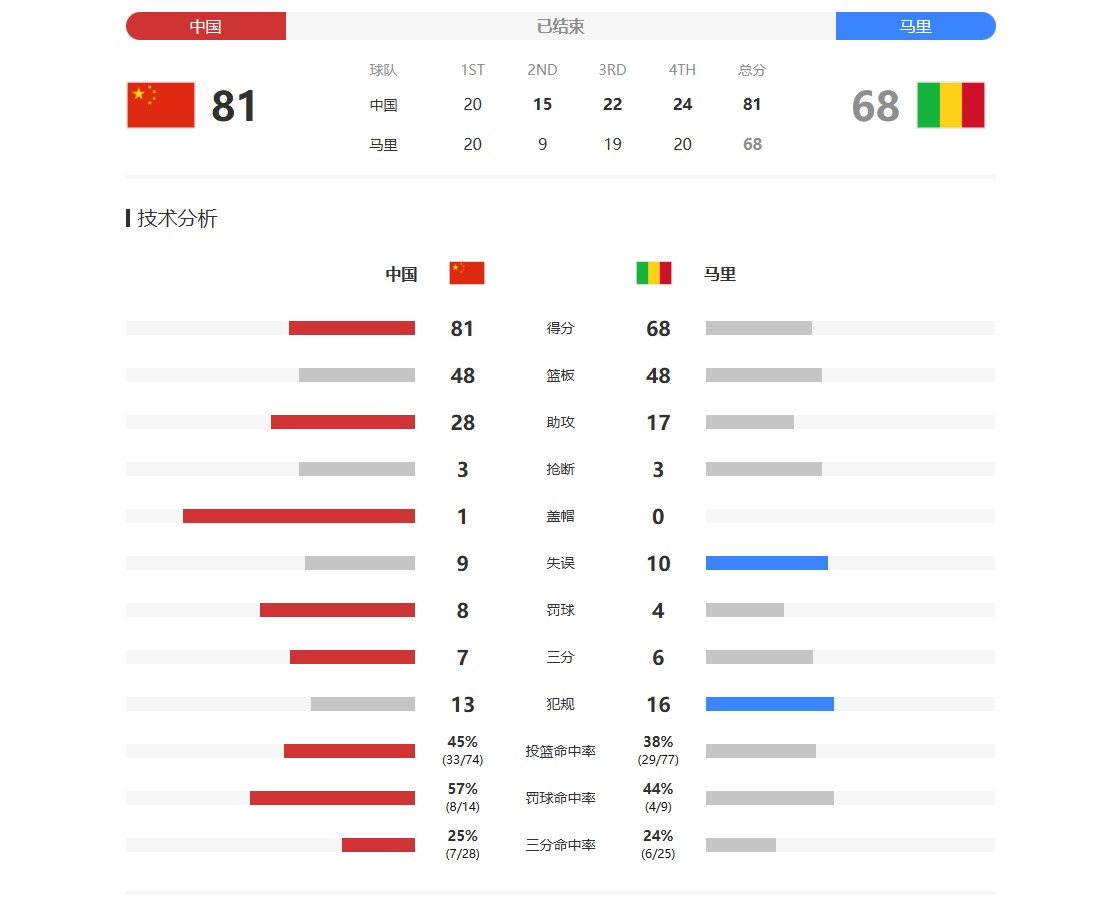 上半场比赛,马里队的篮板球占优30-22,到了下半场,中国队逐渐追上去,最终两队的篮板数都是48个,助攻中国30个占优,马里17个,中国队还有2个盖帽,失误比对手少一个。