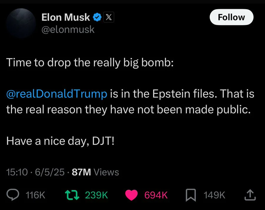 当时,马斯克还在社交平台X上爆料称,“是时候投下真正的重磅炸弹了:特朗普就在爱泼斯坦的档案里。这就是这些文件没有公开的真正原因”,但随后又删除了这条帖子。