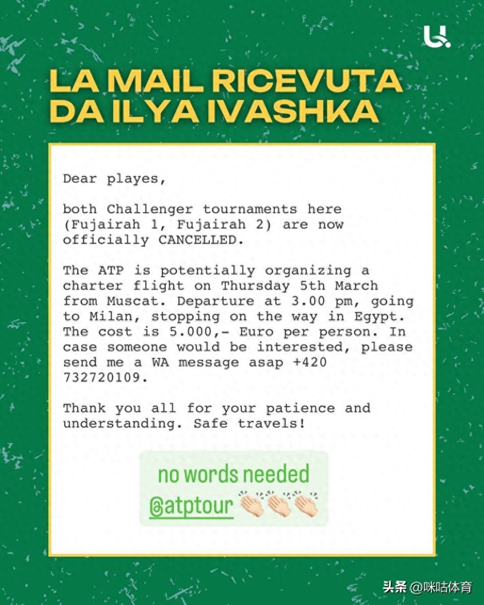 鉴于中东地区安全形势仍不明朗,且潜在风险难以预判,ATP官方经过评估后,最终决定彻底取消富吉拉接下来两周的两站挑战赛,同时表示将协调组织包机,帮助滞留的参赛球员撤离中东地区。根据ATP公布的方案,这架包机将从马斯喀特起飞,经停埃及后最终抵达米兰,为球员提供安全的撤离通道。