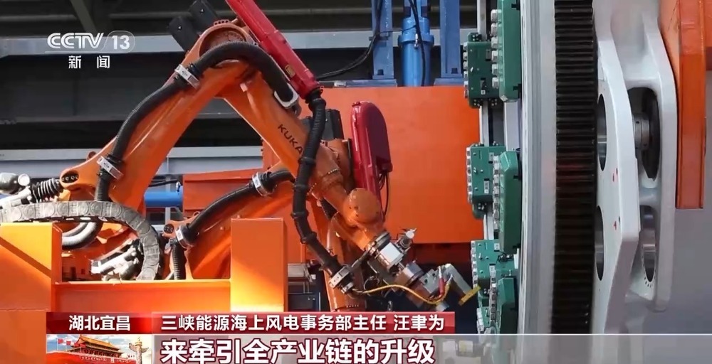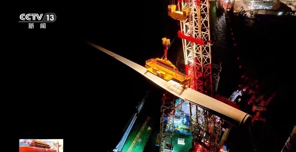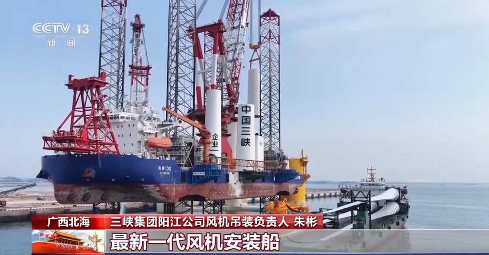 三峡集团阳江公司风机吊装负责人 朱彬:此次吊装是国内首次采用最新一代风机安装船,在码头站桩完成施工,风机塔筒、主机叶片等设备预先运上风机安装船,实现装运一体化,为我国海上风电走向深远海提供了重要技术实践支撑。