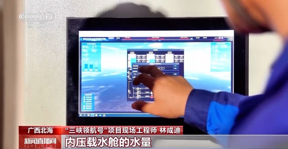 “三峡领航号”项目现场工程师 林成迪:在风机吊装的过程中,浮体的动态压载系统发挥着“智能平衡仪”的作用,我们通过调整浮体三支侧立柱内压载水舱的水量,让浮体的水平度始终保持在千分之三以内。