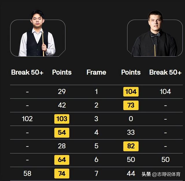 【庞俊旭4-2安东尼·科瓦尔斯基】此役上来,庞俊旭艰难拿下首局,科瓦尔斯基打出单杆78分、连赢两局2-1反超,不过庞俊旭迅速调整,打出了单杆56分和单杆64分、连赢了三局,强势4-2逆转击败了科瓦尔斯基,晋级到了32强。