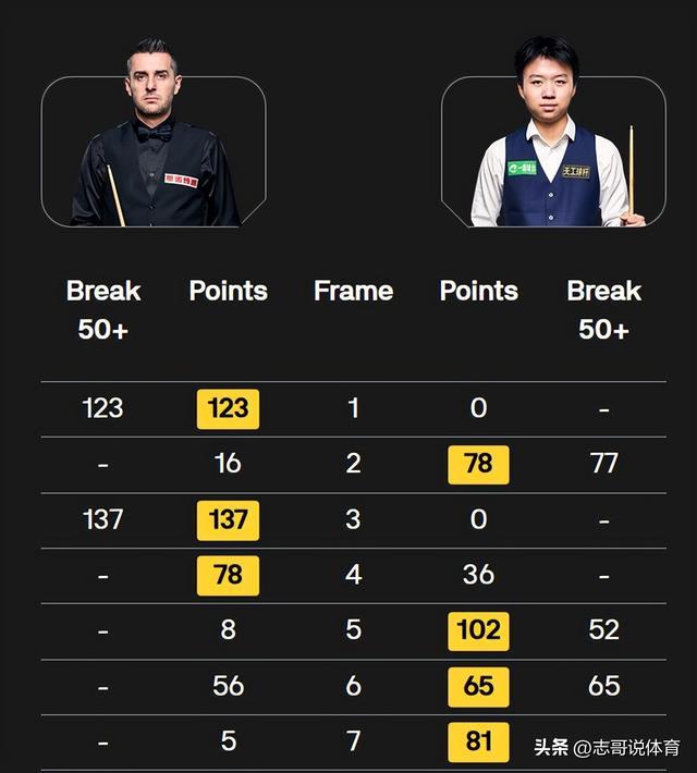 【江俊4-3塞尔比】江俊是中国的00后小将,塞尔比则是卫冕冠军、同时也是世锦赛4冠王,在本赛季塞尔比的状态也是相当出色,拿到了冠中冠和英锦赛的冠军。本场比赛前四局,塞尔比打出了单杆123分和单杆137分、江俊打出了一杆77分,塞尔比3-1拿到了赛点,不过江俊突然爆发,连续单杆52分和单杆65分连赢两局,4-3大逆转绝杀,爆出了一个不小的冷门。