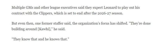 多位总经理和其他联盟高管表示,他们预计伦纳德将在快船履行完当前合同,该合同将于2026-27赛季结束后到期。