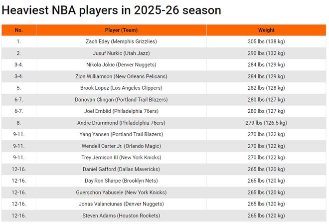 北京时间10月12日,美媒Basketnews晒出了一组联盟球员体重排名,第一是伊迪305磅,第二是努尔基奇290磅,第三是并列约基奇/锡安284磅。