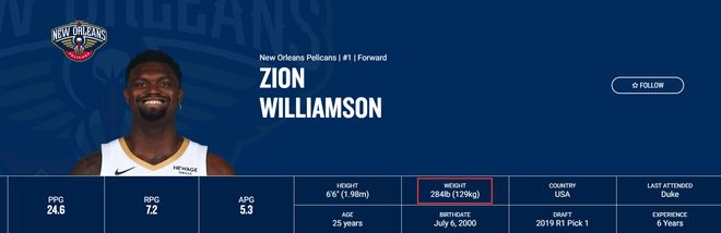 锡安目前的体重的确是284磅(128公斤),身高还是6尺6(1.98米),如果只参考这个身高与这个体重BMI肯定还是超标的,但锡安的身体素质根本就不能用正常数值去分析,他在大学时期就是飞天遁地的存在。