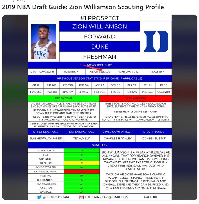 2019年选秀时锡安的选秀报告,体重是285磅,那时候锡安在杜克大学是各种罚球线起跳暴扣,平框暴扣,这说明285磅对于他的膝盖、脚踝来说完全可以承受。