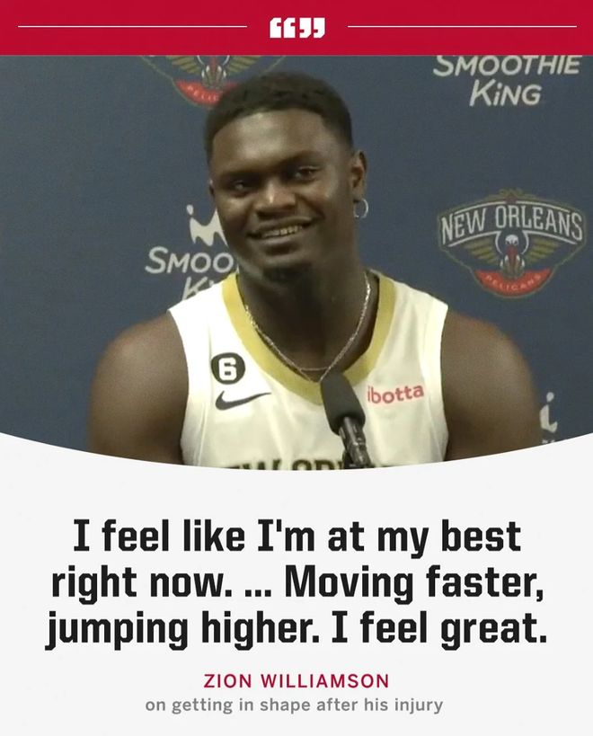正如锡安在媒体日所说的:我的身体状态棒极了,我移动更快了,跳得更高了,我的感觉太棒了。【我相信锡安没有胡说,因为这个体重是他进入联盟以来最轻的,他的弹跳、爆发肯定会很轻松】