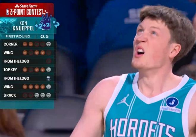 进入决赛比拼,黄蜂新秀克努佩尔率先登场,他第一个点命中4球包括花球,左侧弧顶5中2,随后超远球不中。克努佩尔中路弧顶也只命中2球,超远球继续不中,右侧弧顶命中3球,最后一个弧顶花球只命中2球,最终只得到17分远逊色于预赛的发挥。