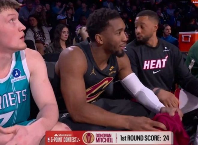 第二位登场的是骑士球星米切尔,他第一个点五连中,右侧弧顶5中4包括花球,随后超远球不中。米切尔中路弧顶命中3球包括花球,随后左侧超远球不中,左侧弧顶5个花球只进2球,最后一个底角命中4球,最终得到24分。