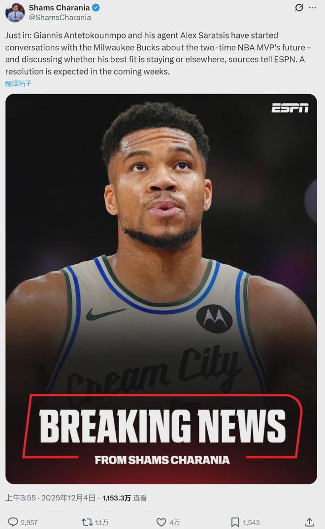今天凌晨,据NBA名记Shams报道,字母哥和经纪人将跟雄鹿管理层展开正式会谈,双方共同探讨字母哥的未来去向。Shams还表示,除非雄鹿在本赛季出现重大转折,否则字母哥离队已成定局,雄鹿的一个时代结束了。